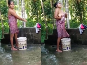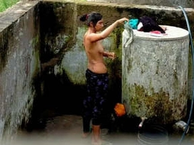 Desi wife takes bath in a village outdoor bathtub
