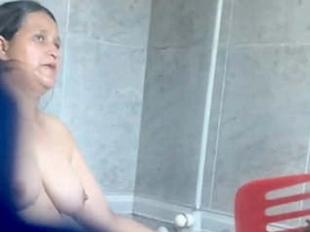 Watch Aunt Dishania's big boobs bounce in the bathroom