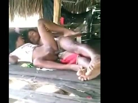 A young couple engages in sexual activity outdoors in a tent on the beach