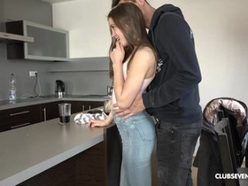 Girlfriend's jeans down and gets pounded hard in standing position